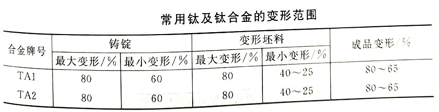 鈦及鈦合金鑄錠具有粗大的晶粒,工藝塑性較差,一般是將鍛 前的鑄錠加熱到相變點以上,主要變形是在區完成。因為在這個 溫度下變形抗力低,塑性高,可以采用大變形量,從而提高鍛透 性,較充分地破碎鑄態組織,同時也能提高生產率,降低消耗。